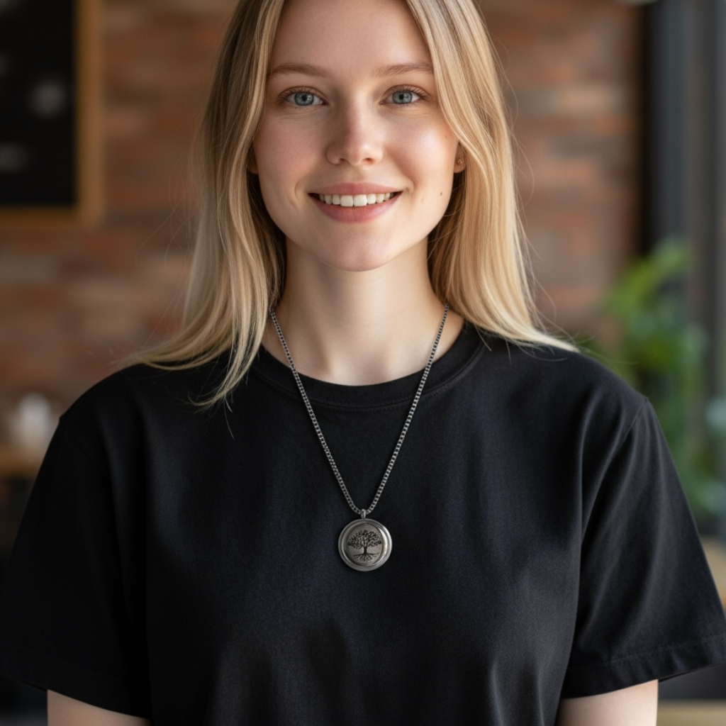 This necklace is perfect for both men and women. It features a serenity pray on one side and a design inspired by the Tree of Life on the other.